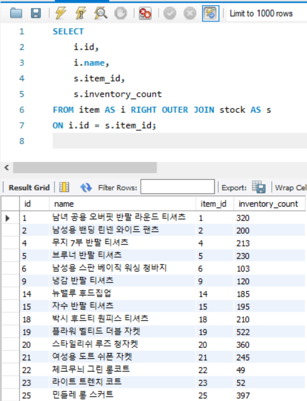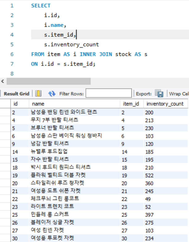 합치는 기준은 밑에 줄 ON item.id = stock.item_id 구문으로 정할 수 있습니다.