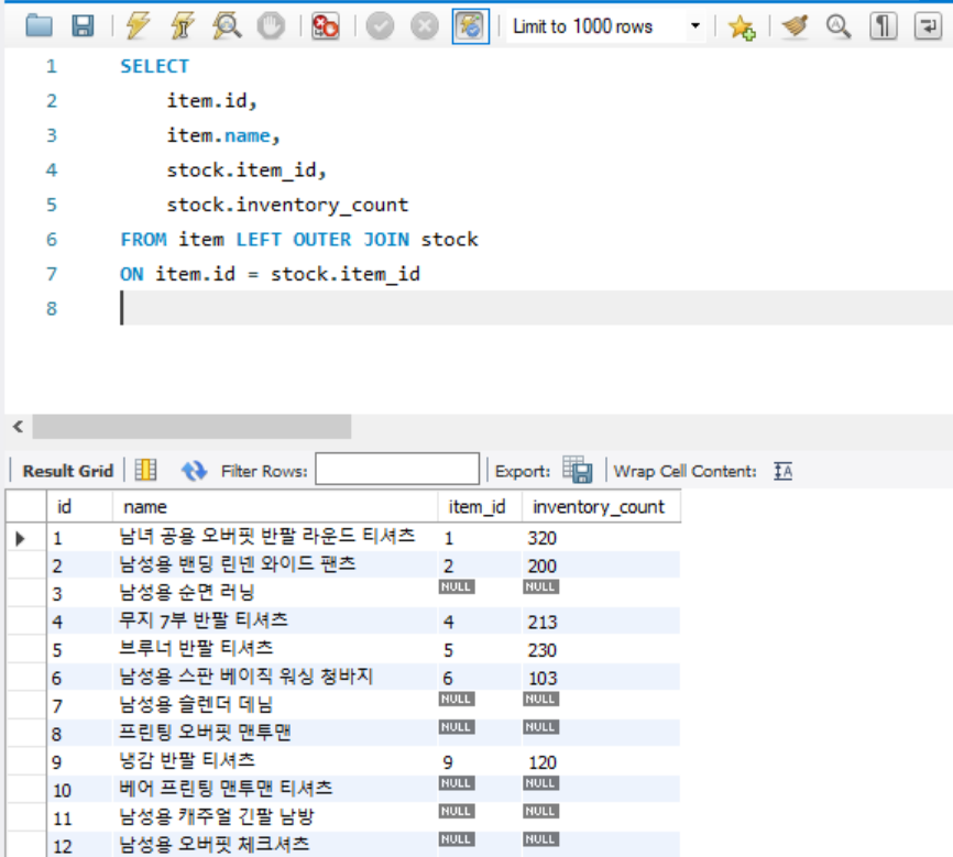 item_id컬럼을 보면 NULL값이 보인다. 그 이유는 left outer join은 왼쪽 테이블을 기준으로 테이블을 합친다는 의미이다. 그래서 item 테이블에는 있지만 stock 테이블에 없는 로우는 이런 식으로 NULL로 표현이 된다.