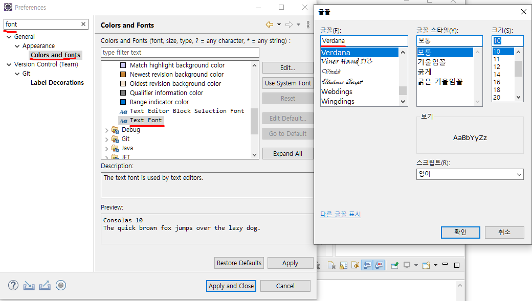 왼쪽 검색창에서 font를 검색해서 Colors and Fonts를 누른다.