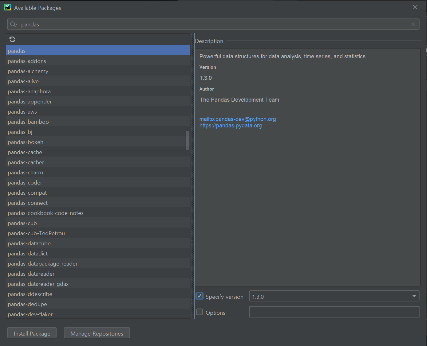 +를 누르게 되면 다음과 같은 창이 뜨게 되는데, 검색창에서 pandas를 검색하고 Specify version을 체크한 다음에 Install Package를 눌러주게 되면 pandas라는 패키지가 설치되게 된다.(Specify version은 패키지의 버전을 의마한다. 보통 가장 최신의 버전으로 설정되어 있다.)