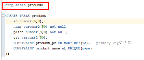 기존 product테이블이 있기때문에 삭제하고 product테이블을 다시 만든다
