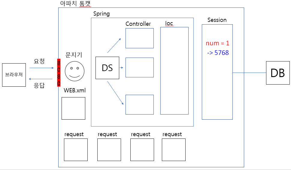 클라이언트가 요청 - 문지기(web.xml)통과 - 톰캣이 request,response 생성 - DS(dispatcher Servlet) -