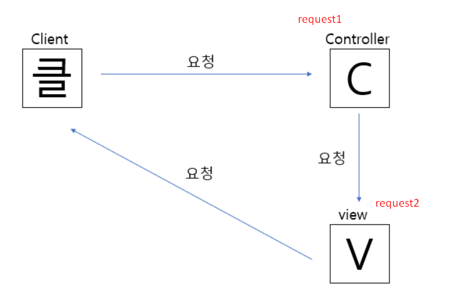 request2에는 클라이언트가 Controller에게 요청할때의 데이터 request1은 가지고 있지 않다.